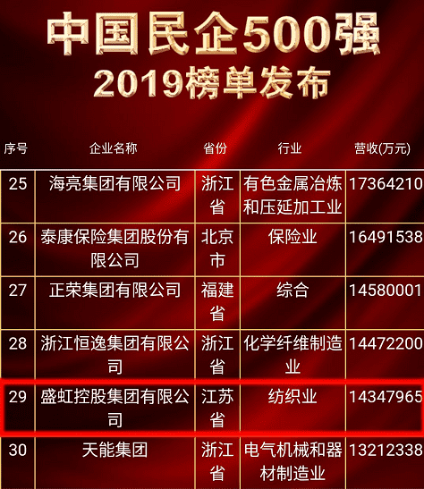 8月22日,2019中国民营企业500强峰会在青海西宁开幕,全国工商联发布了《2019年中国民营企业500强报告》。盛虹控股集团2018年实现营业收入1434亿元,排名中国民营企业500强第29位,排名中国民营企业制造业500强第13位,分别比去年上升9位和6位,以高质量发展的姿态稳居中国民营企业前列!